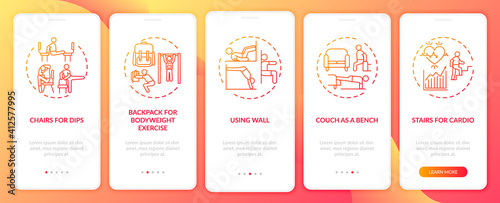 Gym training alternatives onboarding mobile app page screen with concepts. Couch as bench, using wall, walkthrough 5 steps graphic instructions. UI vector template with RGB color illustrations
