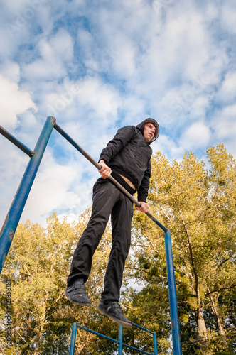 Gymnast performs exercises on the crossbar in nature