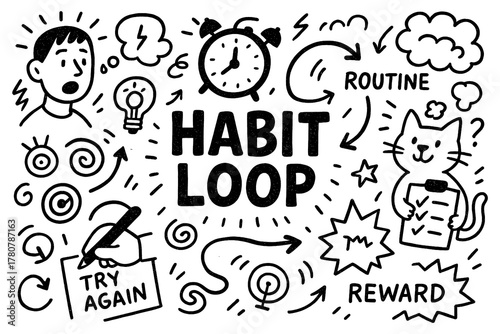 Habit loop psychology concept with cue, routine, and reward cycle symbols in black and white doodle style, Transparent Background