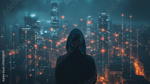 Hacker are planning to hack and attack networks and cyber security systems. Smart Innovation city with connection future wireless digital city and social media networking over the cityscape.
