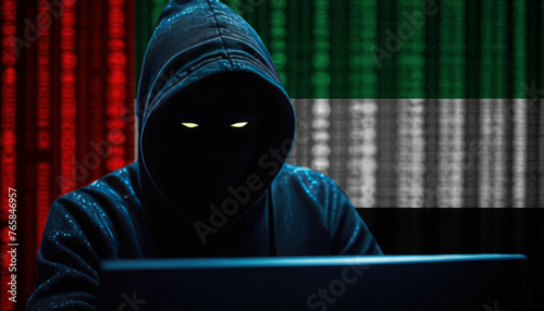 Hacker in a dark hoodie sitting in front of a monitors with United Arab Emirates flag and background cyber security concept