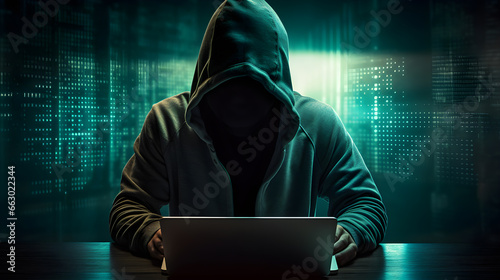 Hacker in black hood using laptop trying to cyber attack with binary code digital interface. Cyber criminal stealing user personal data. Hacker attack and web security.