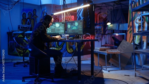 Hacker in hidden base successfully getting past anti tamper measures implemented by companies to protect products. Cracker pirating software and video game releases, camera A handheld camera shot