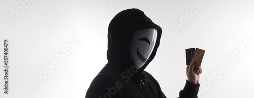 Hacker man and credit cards in hand. Represent credit cards personal data stolen by anonymous man in Black hood shirt. Credit cards data security and Cyber crime digital. Money transection unsecured.