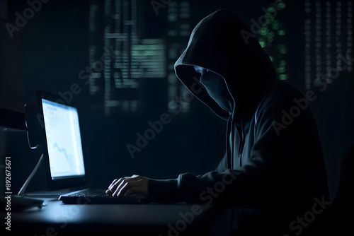 Hacker typing computer. Concept of cybercrime, cyberattack, dark web. AI generated