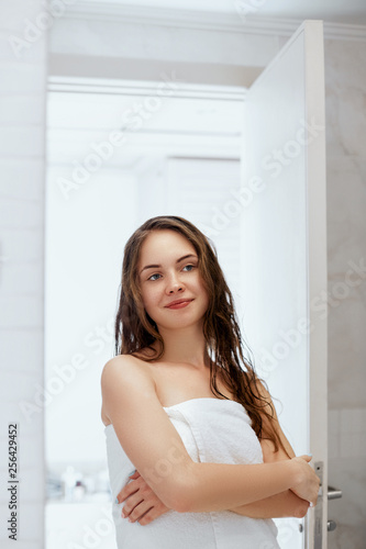 Hair and body care. Woman touching wet hair and smiling while looking in the mirror. Portrait of girl in bathroom applying conditioner and oil.Portrait of female uses protection moisturizing cream.