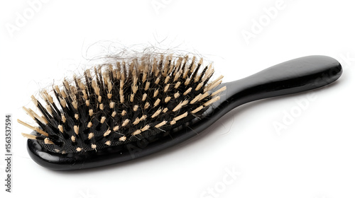 Hair loss problem concept with hairbrush and fallen hair on white background