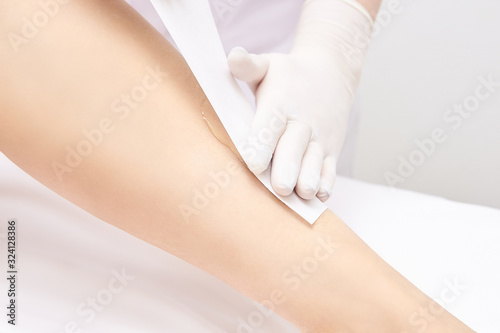 Hair removal at spa luxury studio. Woman legs wax with shugaring. Hot sugar