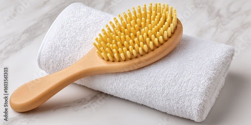 Hairbrush Resting Upon Folded Towel, Relaxing, Marble background