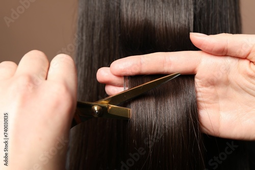 Hairdresser cutting client's hair with scissors on light brown background, closeup