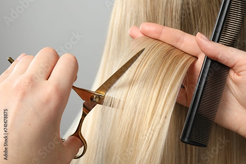 Hairdresser cutting client's hair with scissors on light grey background, closeup