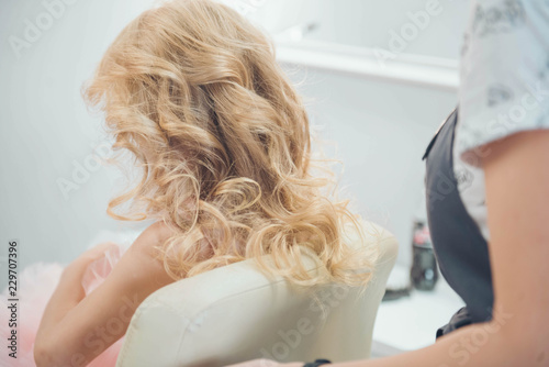 Hairdressing services. Сreating hairstyle. Hair styling process. Children's hairdressing salon.