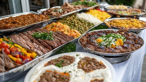 Halal food religion faith connection. A vibrant buffet spread featuring various dishes and colorful garnishes.
