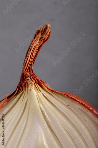 Half a bulb onion. Gold onion vegetable. Raw hide close up.