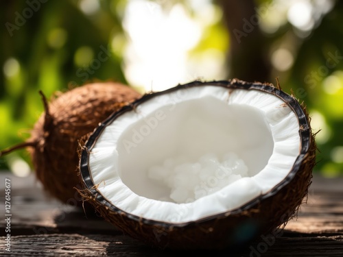 Half Coconut with Coconut Meat on Wooden Surface
