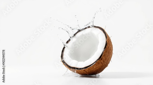 Half coconut with splashing water on white background studio shot