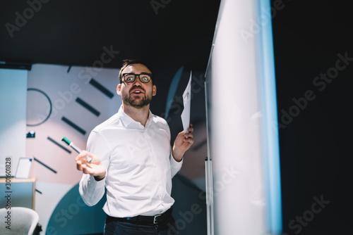 Half length portrait of amazed businessman formally dressed looking at camera during working time for creating presentation in boardroom, wonder male broker in optical spectacles for eyes protection