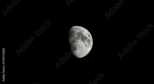 Half Moon in Black Sky with Clear Details and Textures Captured at Night
