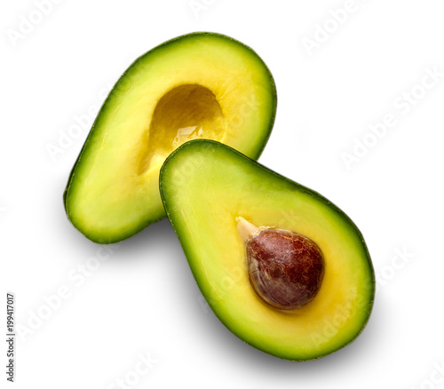 Half of avocado. Avocado isolated on white background. Avocado tree. Top view.