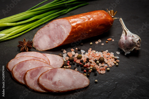 half of smoked ham sausage with garlic and green onions