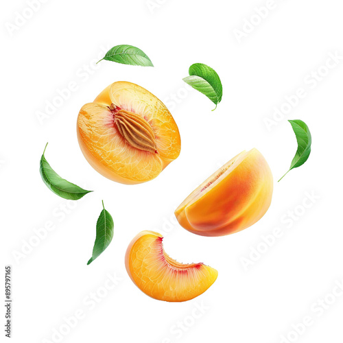 Half peach pieces flying in air with green leaves, isolated on the white background.