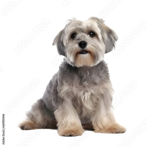 half side view, adorable gray dandie dinmont sitting in front of transparent background, looking left up side.
