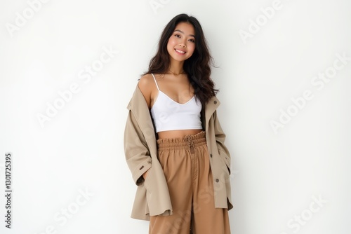 Half-Length (Waist-Up) portrait of young stylish smiling Bruneian female model in bohemian wear isolated on pure white background looking at camera