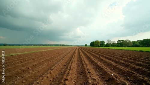 Half-plowed earth with a narrow band of trees visible beyond the horizon on an overcast day, blurred trees, natural scenery, cloudy sky