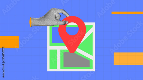 halftone collage, Modern navigation concept with a red location hand holding pin on a digital map. map illustration