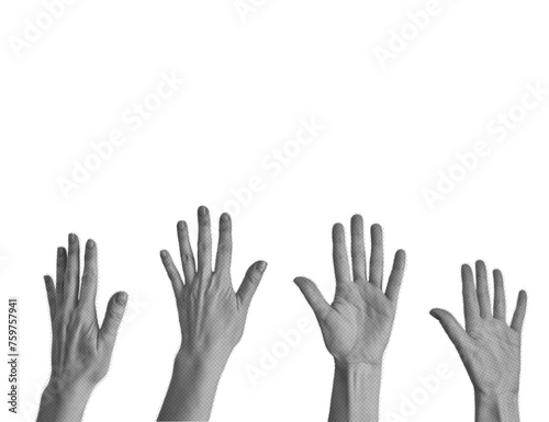 Halftone collage of people's hands on a transparent background. Contemporary banner and poster