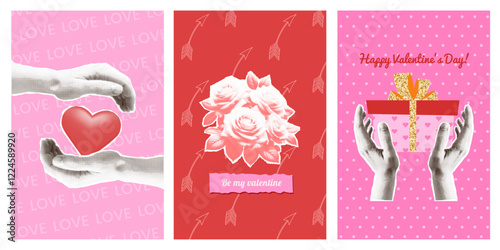 Halftone Valentine's Day Posters with Hands heart, gift, roses