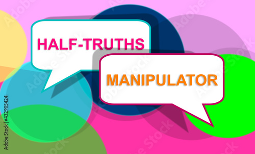 HALF-TRUTHS and MANIPULATOR. Speech bubbles. Two dialog balloons. Cheerful geometric elements.