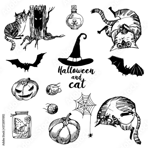 Halloween and funny cats. Banner design. hand drawn vector illustration and watercolor texture