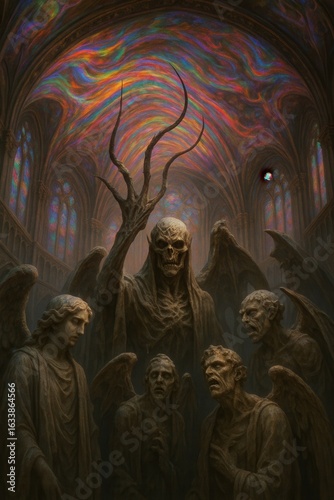 Halloween artwork of a skeletal demon with long horns raising an arm among stone angelic figures under a swirling rainbow vortex on the ceiling of a gothic cathedral