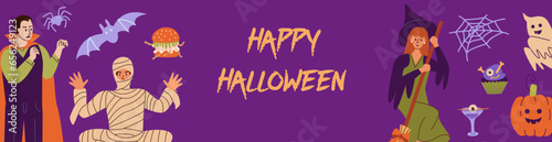 Halloween atmosphere Horizontal long banner witch scary carnival clothing. Happy people at masquerade Halloween party.