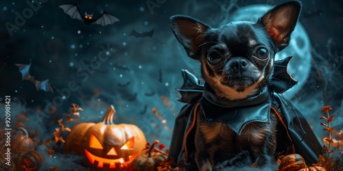 Halloween Chihuahua dog dressed as bat, night sky with moon, pumpkin, banner copy space