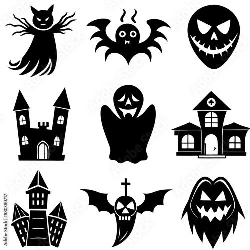 Halloween collection - Jack o'lantern, ghosts, spiders, broomstick, bats, witch hat, spiderweb black silhouettes. Illustration on transparent background