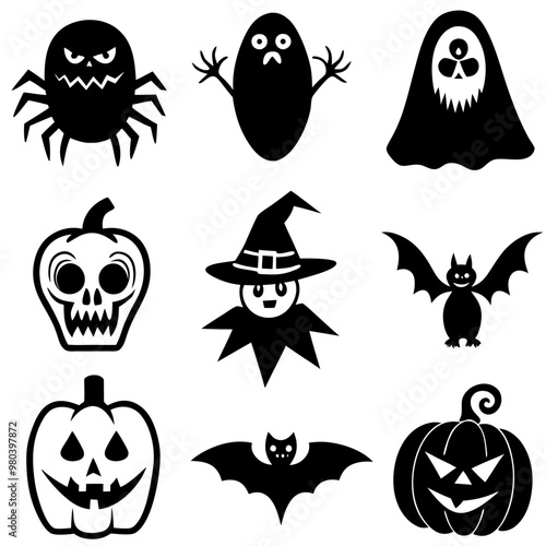 Halloween collection - Jack o'lantern, ghosts, spiders, broomstick, bats, witch hat, spiderweb black silhouettes. Illustration on transparent background