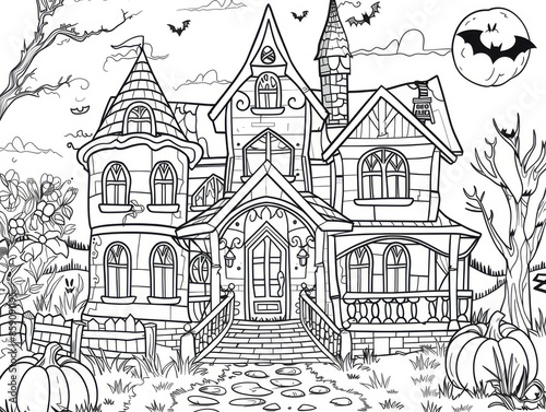 Halloween Colouring Sheet: Haunted House for Kids. Printable 11x8.5 Inch Halloween Pumpkin and House Coloring Page