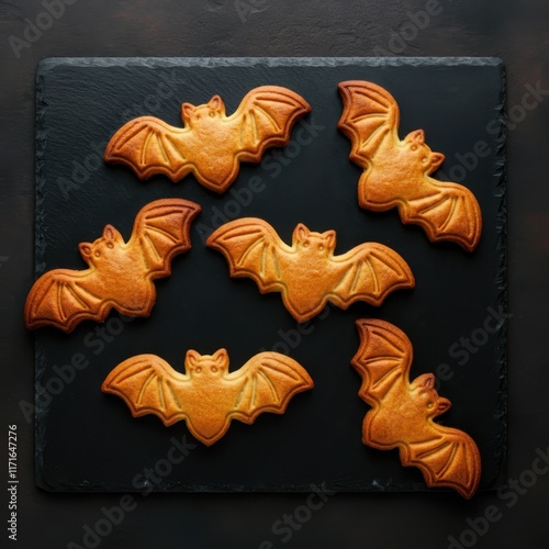 Halloween cookies, bat-shaped pastries, orange-colored treats, black slate background, overhead view, spooky baked goods, festive desserts, intricate wing details, symmetrical arrangement, seasonal ba