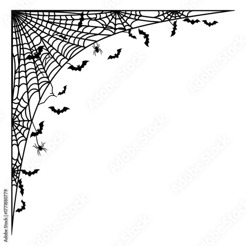 Halloween corner decoration with spider web and bats silhouette isolated on white background