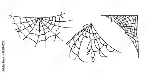 Halloween decor, spider cobweb, hand drawn vector illustration isolated on white background. Vintage, doodle sketch set.