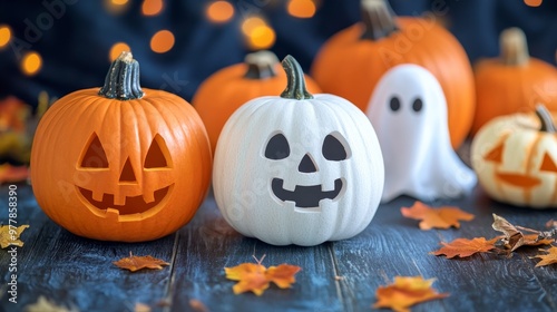 Halloween decor with carved pumpkins and ghost ornaments for a cheerful celebration!