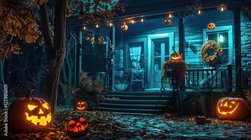 Halloween decorated rustic porch at night with jack-o'-lanterns