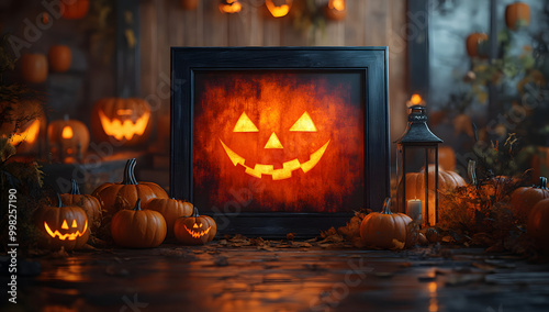 Halloween Display with Framed Jack-o'-Lantern and Pumpkins