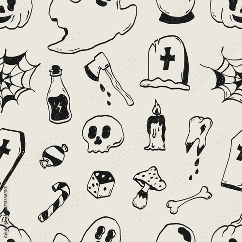 Halloween elements seamless pattern. Sketch drawing. Hand drawn skull, pumpkin, ghost, mushroom, spider web. Vector illustration.