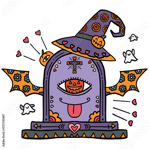 halloween festival. Whimsical Halloween-themed illustration of a grave with a witch hat. retro trendy groovy halloween illustration in doodle pastel color line style