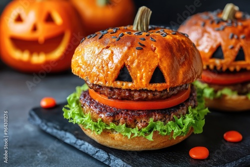 Halloween funny Monster cheeseburger on the wooden background. AI Generated