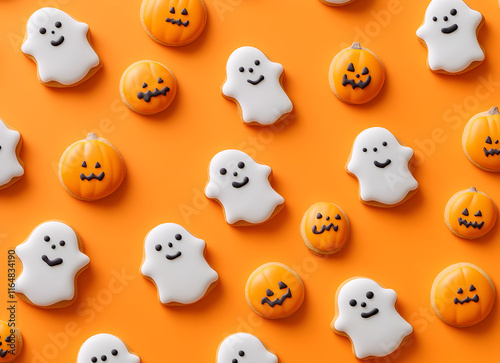 Halloween Ghost and Pumpkin Cookies Pattern on Orange Background