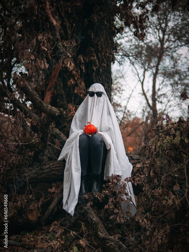 Halloween ghost in sunglasses sitting in autumn park and holding pumpkin